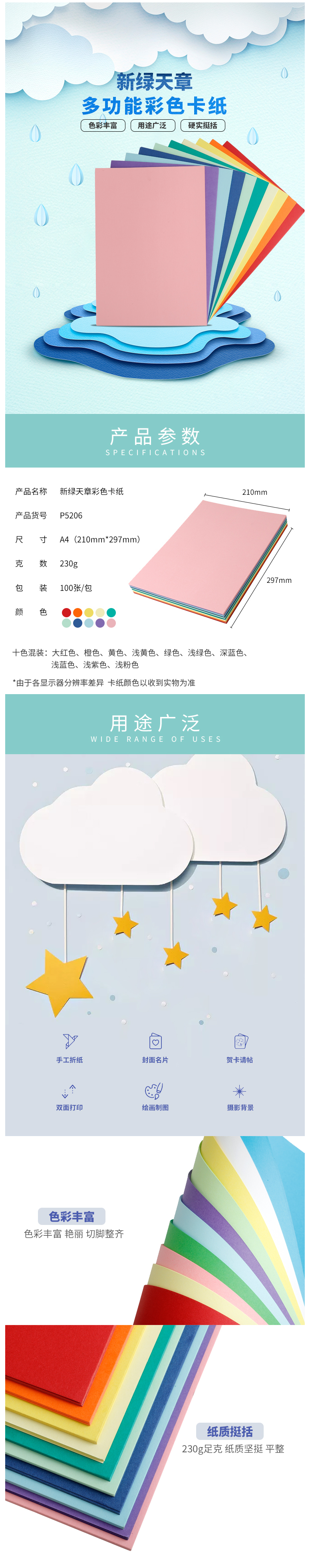 天章(TANGO)A4彩色卡纸硬卡纸加厚A4纸十色纸混装230g100张/包 自营